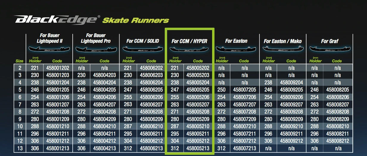 BlackEdge CCM Hyperglide Black Steel Skate Runners are premium black DLC coated steel for CCM Speedblade +4.0 holders. BlackEdge black steel has an extremely loyal following from minor hockey players to beer league players to NHL players, such as Brad Marchand. BlackEdge CCM Hyperglide Black Steel Skate Runners provide you with more power, more speed, and better edge control to achieve your desired performance. These runners are compatible with the CCM Speedblade 4.0 holders only; will not fit CCM ePro or Prolite holders.