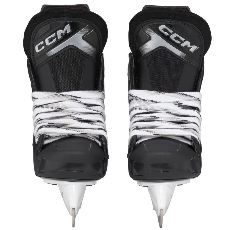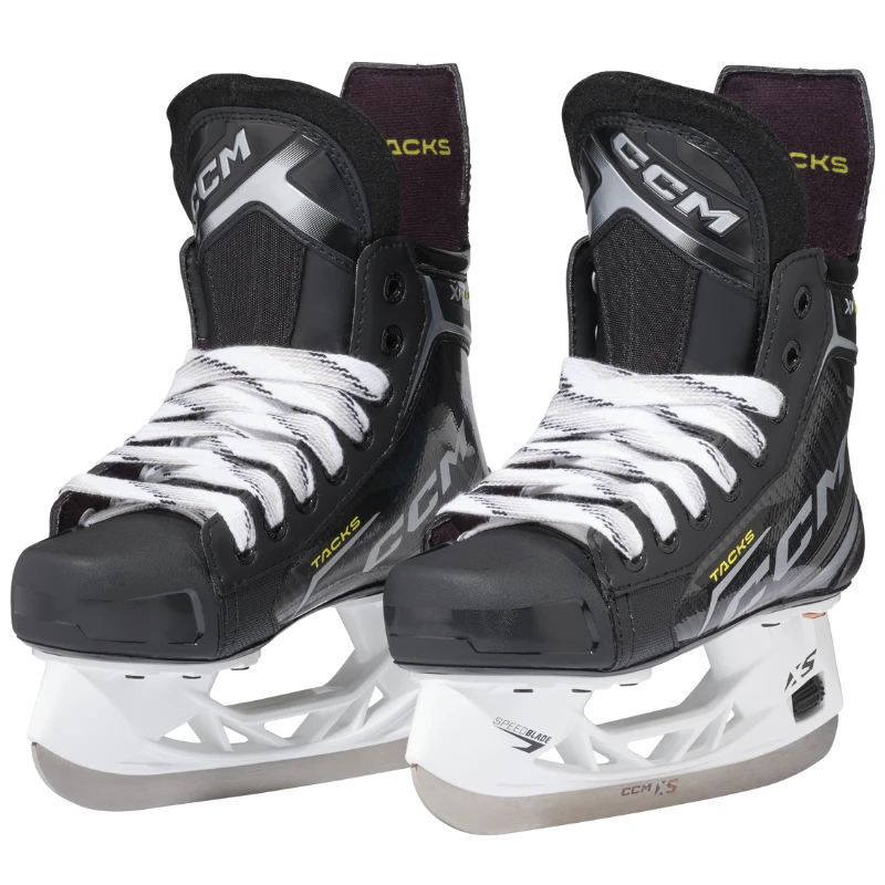 The CCM Tacks XF70 boot features a 2D metaframe construction made from synthetic composite with a faux carbon skin, offering a comfortable ergonomic shape within a lightweight and durable design. Inside, the HD microfiber liner provides high resistance to wear and tear, complemented by an EVA layer for added comfort and a better fit. The 7mm black felt tongue includes foam core reinforcement for top-of-the-foot comfort and protection against stray pucks and slashes, effectively preventing lace bite. Completing the skate is the XS Speedblade holder paired with the CCM XS runner, whose spring-lock system securely fastens the blade and allows for efficient blade swaps. Overall, the CCM Tacks XF70 hockey skate is an excellent choice for recreational or newer skaters seeking a comfortable, durable skate with quality features for occasional use.